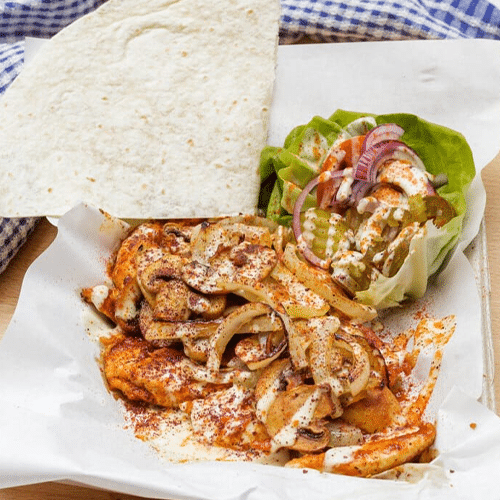 Lapje steak met gebakken ui, gesmolten cheddar, verse jalapeños en huisgemaakte knoflook saus.